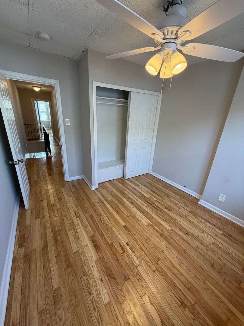 Move-in ready 3-bed, 1-bath rowhome with freshly refinished hardwood floors throughout the main level and all three bedrooms. The eat-in kitchen sits at the back of the home with granite counters, gas stove, full-size refrigerator, and microwave, with a door opening to a private fenced rear patio. Upstairs has three bedrooms with ceiling fans and a full bath with tub/shower. The front bedroom features a classic South Philly bay window.