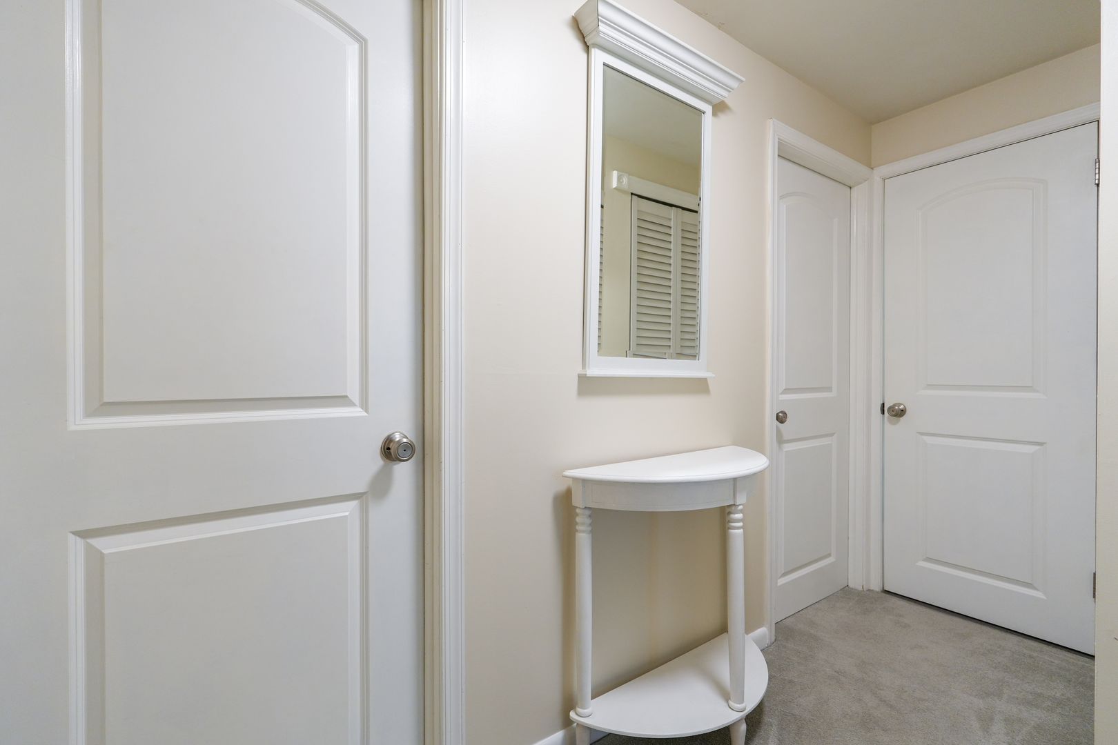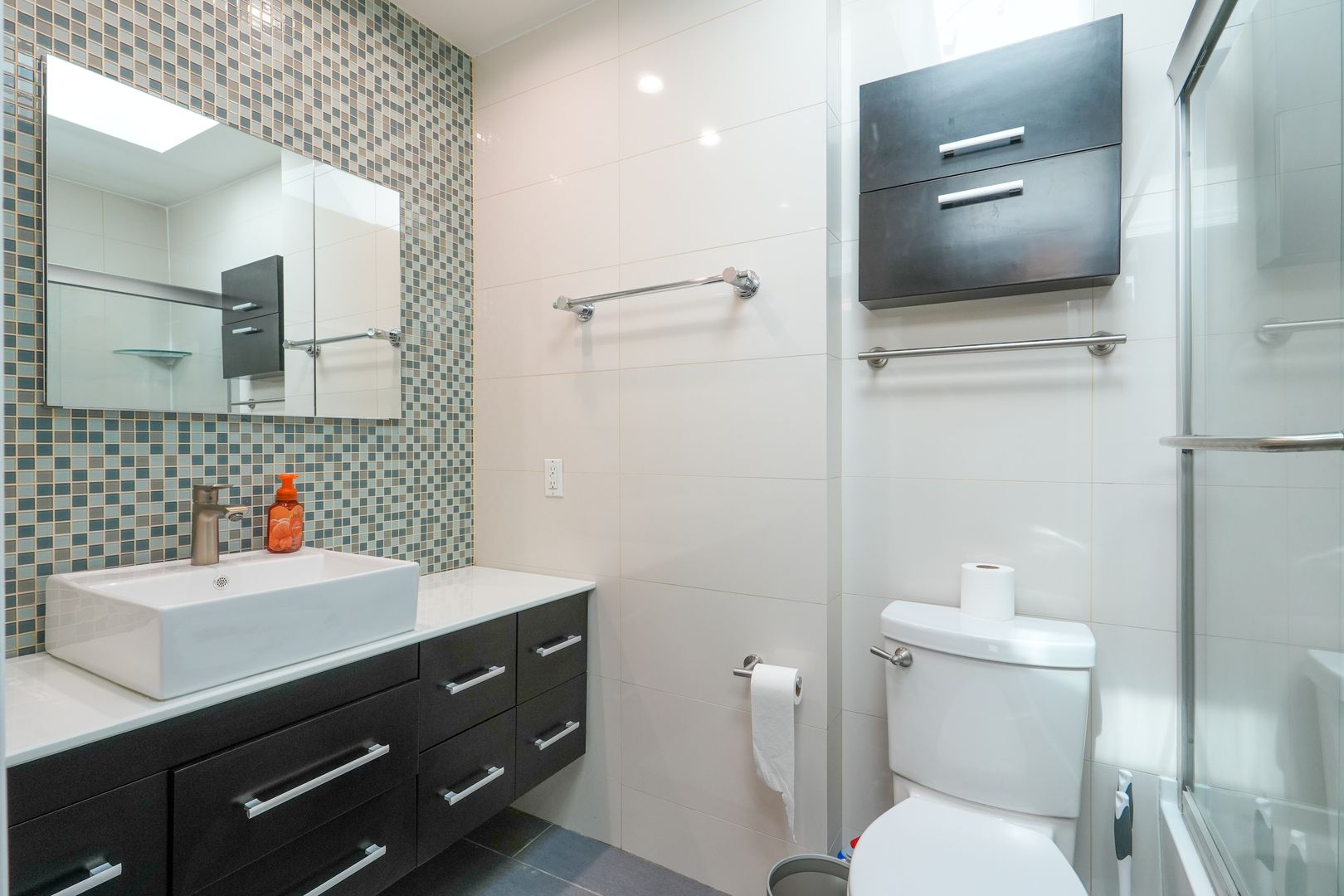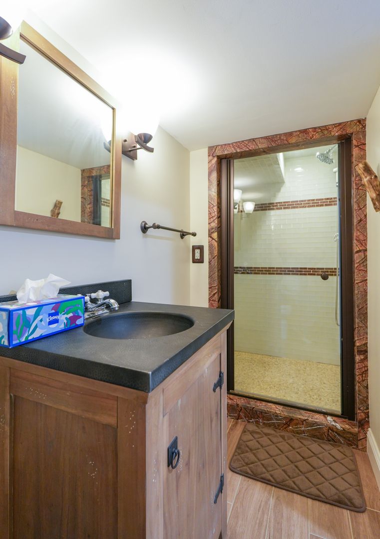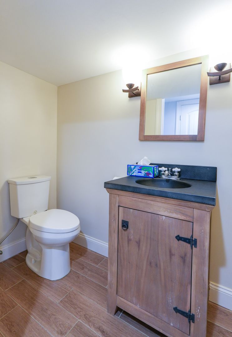 Upstairs, the generously sized bedrooms offer abundant natural light and closet space; one has been thoughtfully converted into a dedicated walk-in closet, providing versatile use as wardrobe storage, a home office, or bonus area. Both full bathrooms feature sleek vanities, clean neutral tile surrounds, high hat lighting, and spacious shower areas for a fresh, spa-like feel.